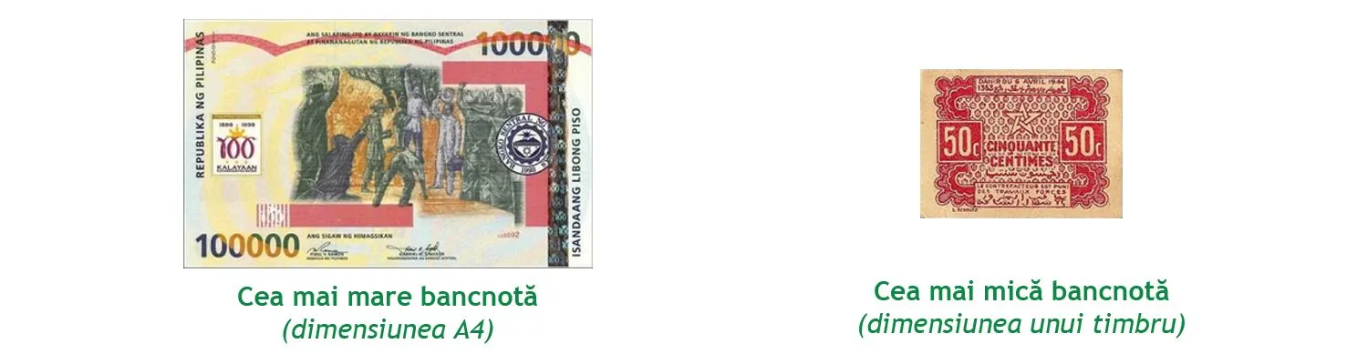 Primele bancnote funcționau în modul următor: bancherii sau aurarii, păstrau monedele în locuri sigure și eliberau niște chitanțe, unde indicau suma totală de bani. Cu timpul, hârtiile eliberate au început să fie folosite ca mijloace de plată, iar utilizarea lor a dat naștere bancnotelor pe care le știm astăzi. Apropo, știai că cea mai mare bancnotă din hârtie este de dimensiunea unei foi A4 și valorează 100.000 de peso filipinezi? Iar cea mai mică bancnotă din lume au emis-o cei din Marocco, având dimensiunea unui timbru pentru scrisori.